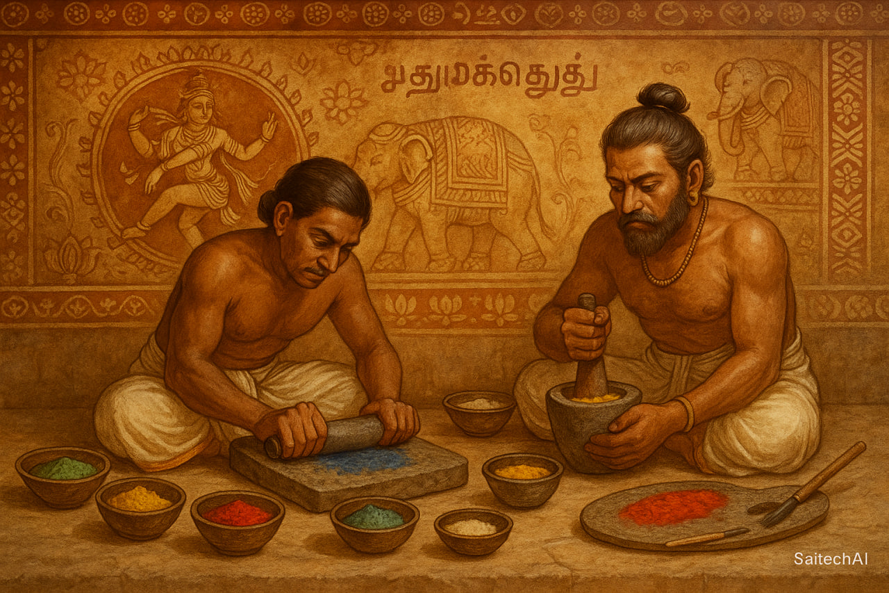 Comparisons: Ajanta murals (Maharashtra, 2nd BCEโ6th CE) show similar pigments, but Tamil temples innovated by mixing herbal binders (neem oil, plant gums) that prevented fungal growth.